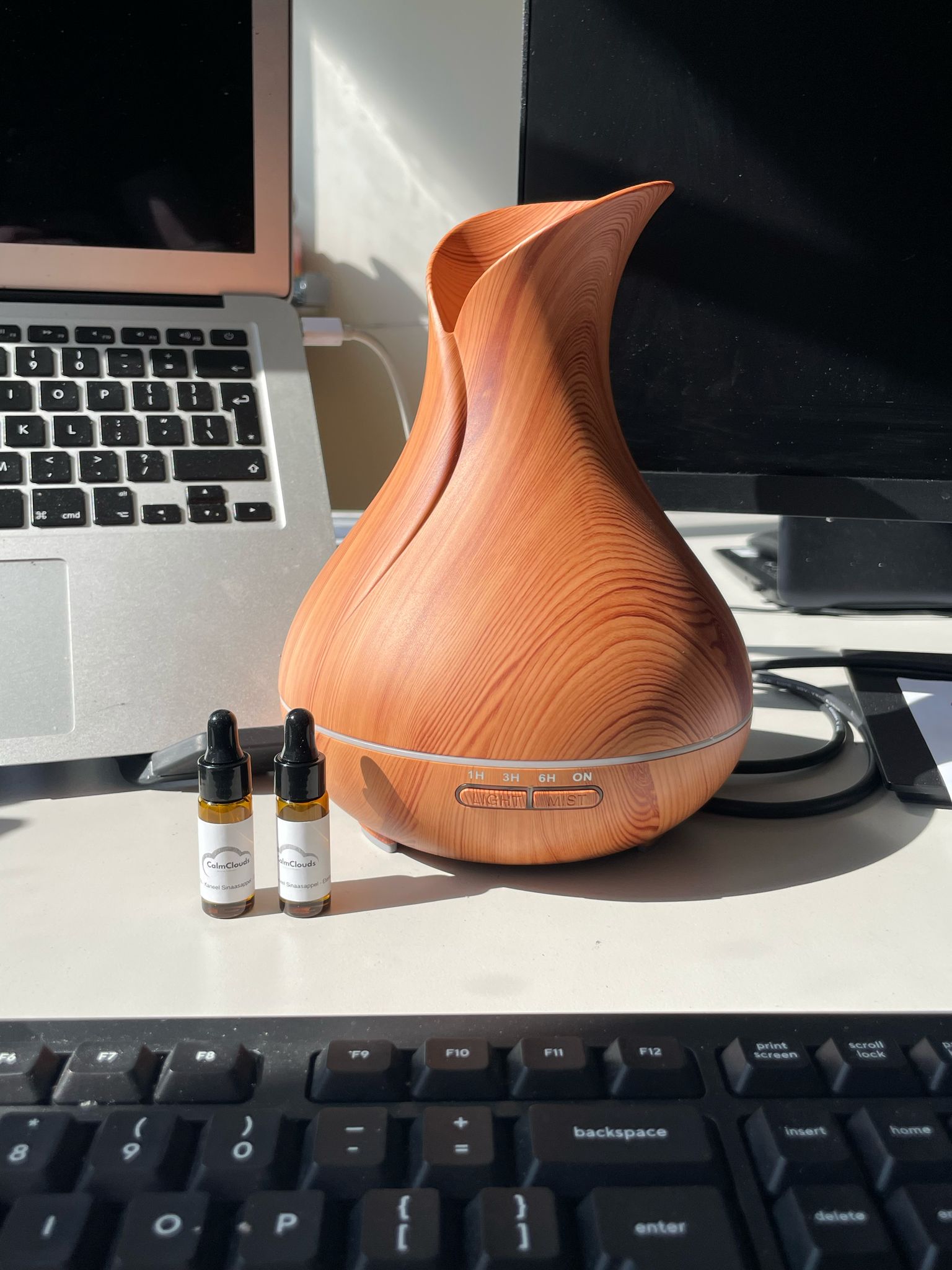 De Elara Bloom gebruikt ultrasone trillingen om water en olie om te zetten in een koele mist. Dit bevochtigt de lucht én verspreidt een zachte geur, zonder hitte of verbranding.